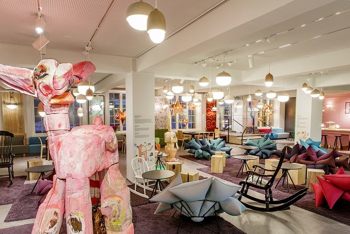 Helsingin Kaupunginmuseon aulatilaa hallitsee yksi pinkki katseenvangitsija. Kun pääset katsellaasi tutkimaan myös muuta, niin huomaat että avara tila on jaettu matoilla ja erityyppisillä istuimilla omiksi pikku “huoneiksi”.